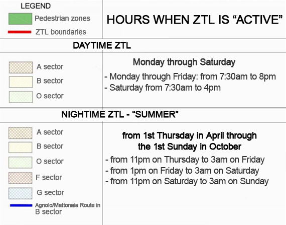 - The first one: the SUMMER EXTENSION! From the first Thursday in April until the first Sunday in October (longer than actual summer months), the ZTL is also "active" (which means it is prohibited to enter) DURING EVENINGS/NIGHTS on Thursdays, Fridays and Saturdays from 11pm to 3am on the following morning. This is because there are many weekend events during the summer evenings and people hanging out at restaurants, clubs and enjoying night life when the weather is fine. Many would enter the ZTL by car so by restricting the entrance of cars on these nights, traffic is reduced within the center. The ZTL area is also extended to cover additional areas beyond the traditional daytime ZTL for these night-time summer evenings... so when in doubt, just walk around downtown and leave the car parked in a lot or far away.